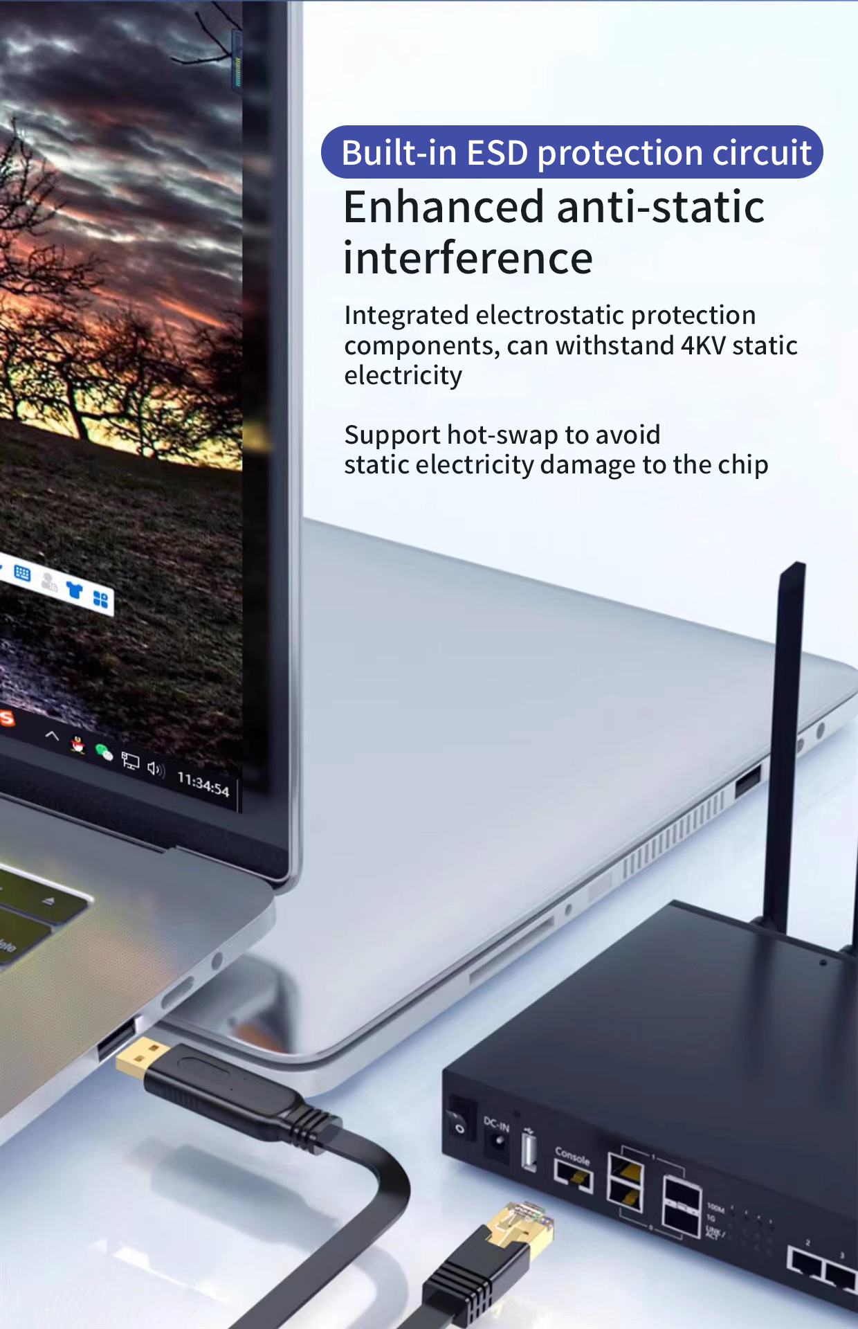 Built-in 4kV ESD protection safeguards the cable and connected equipment from static electricity discharge, significantly reducing the risk of damage during hot-swapping or device maintenance.